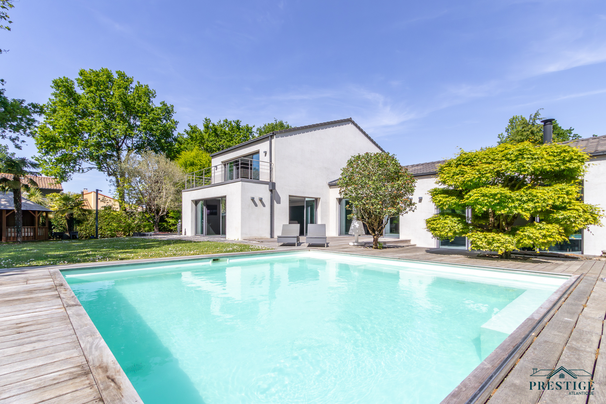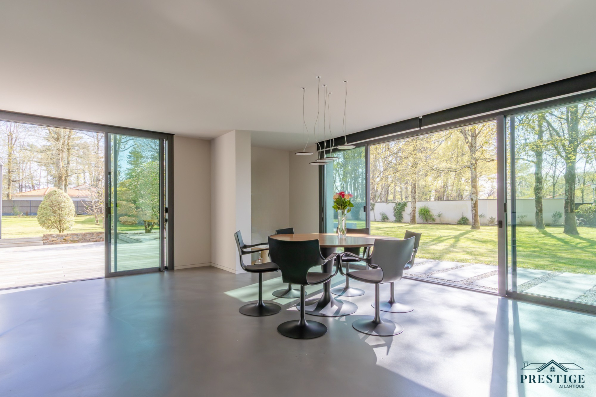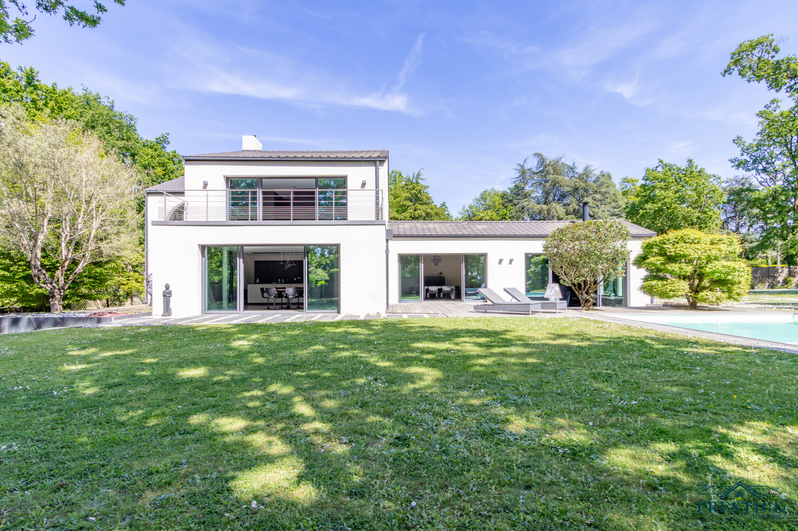 EXCLUSIVITE - PRESTIGE ATLANTIQUE. Dans un environnement privilégié et à l’abri des regards, au sud de Nantes et sur la commune de Basse-Goulaine, cette élégante villa d’architecte entièrement rénovée en 2016 déploie 344 m² habitables. Un hall d’entrée s’ouvre sur une somptueuse pièce de vie avec un espace bar, sublimée par un poêle Gyrofocus. La cuisine aménagée et équipée, aux prestations d’exception (équipements V-Zug et Miele), s’intègre avec élégance à l’ensemble. De larges baies vitrées offrent une vue dégagée et prolongent naturellement l’espace vers une vaste terrasse avec piscine, effaçant les frontières entre intérieur et extérieur. Son espace nuit accueille une master room avec une salle d’eau, un dressing ainsi qu’une terrasse. Un bureau ainsi qu’une arrière cuisine / buanderie complètent le Rez-de-jardin. Un magnifique escalier contemporain permet d’accéder au niveau supérieur ou un vaste palier donne accès à trois chambres avec dressing dont une seconde magnifique master room jouissant d’une immense terrasse privative à la vue imprenable sur le jardin, d’une salle de bains avec douche et un dressing. Une pièce dédiée à la détente ou au cinéma et une salle d’eau vient parfaire l’étage. Edifiée sur un parc paysager de 2 826 m2 entièrement clos, un pavillon d'été, un garage pour quatre voitures ainsi qu’un carport donnent une touche finale à ce bien d’exception. Cette propriété de prestige incarne avec justesse l’alliance subtile d’une architecture contemporaine et d’un art de vivre exclusif au cœur d’un écrin intimiste. Les informations sur les risques auxquels ce bien est exposé sont disponibles sur le site Géorisques http://www.georisques.gouv.fr. Prix de vente 1 596 000€ HAI dont 5 % d'honoraires agence à la charge de l'acquéreur soit un prix net vendeur de 1 520 000€. Prestige-Atlantique. (RCS. Saint-Nazaire 897 587 945 - CPI 44022021000000013) contactez l'agence au 02.40.21.91.13