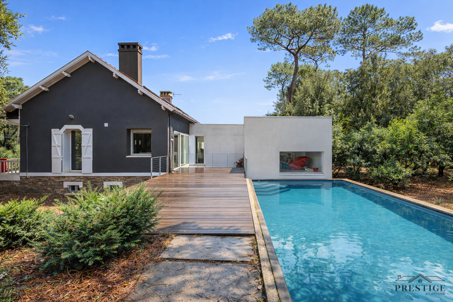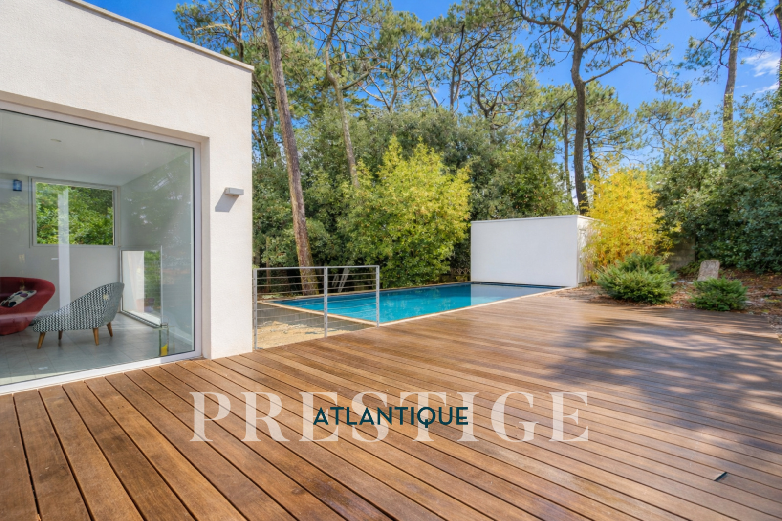 EXCLUSIVITÉ - PRESTIGE ATLANTIQUE. Nichée dans un écrin de verdure, au cœur des pins et à proximité immédiate des plages et des commerces, cette superbe villa balnéaire du début des années 1900 a fait l’objet d’une rénovation complète accompagnée d’une extension offrant des prestations soignées et de qualité, elle développe une surface habitable de 205 m² répartie sur trois niveaux. Une entrée dessert une spacieuse pièce de vie composée d’une cuisine aménagée équipée haut de gamme ainsi que d’un salon agrémentée d’un poêle bois, l’ensemble baignée de lumière de par de larges baies vitrées venant effacer les limites entre l’intérieur et l’extérieur, le tout en accès direct à sa terrasse sublimée de sa piscine surplombant le jardin. Une chambre ainsi qu'une salle de bain viennent parfaire la distribution de ce niveau. L’étage se compose de deux suites avec salle d’eau privatives et d'un dressing central. Une attention toute particulière pour le rez-de-jardin bénéficiant d’un vaste espace parental jouissant d'un accès à la terrasse au panorama du parc. Un bureau, une buanderie ainsi qu'une salle dédiée aux événements festifs donnent une touche finale à ce bien d’exception alliant le charme de l'ancien et le moderne. Édifiée sur une parcelle entièrement close de 1368 m² paysager et arboré, un grand garage de 45m2 donne une touche finale à ce bien à la situation géographique exceptionnelle.“Les informations sur les risques auxquels ce bien est exposé sont disponibles sur le site Géorisques http://www.georisques.gouv.fr”. Pour plus de renseignements ou pour organiser une visite privée, contactez-nous sans plus attendre, PRESTIGE ATLANTIQUE 02.40.21.91.13. Prix de vente 898 000€ FAI dont 5% d'honoraires agence à la charge de l'acquéreur soit un prix net vendeur de 855 238€ (RCS. Saint- Nazaire 897 587 946).