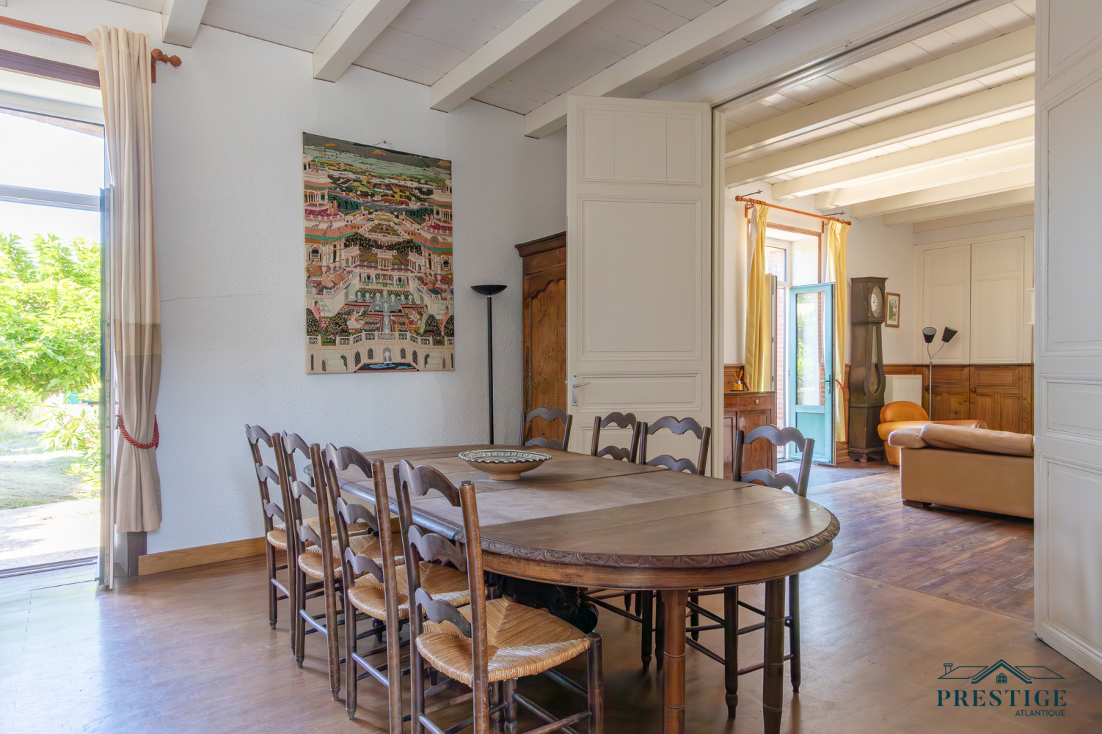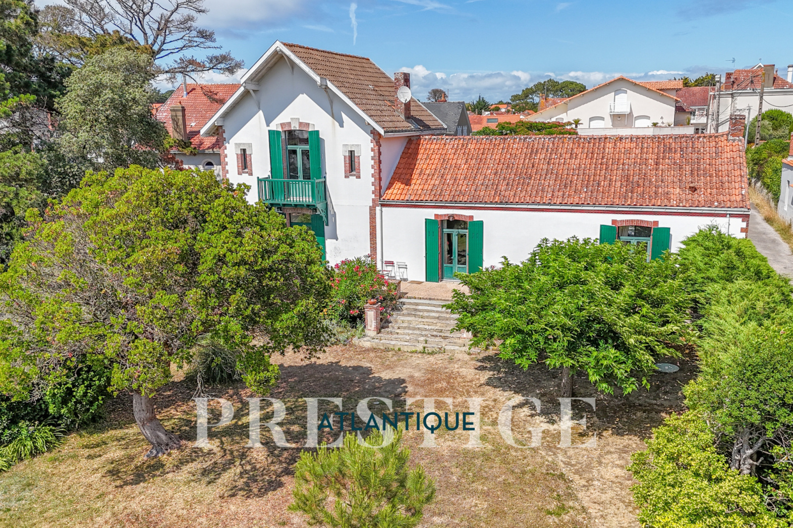 EXCLUSIVITÉ - PRESTIGE ATLANTIQUE. À seulement quelques pas du marché, des plages et des commerces, cette propriété d’exception de 323 m² utiles à l’abri des regards est une véritable perle rare. Elle offre tout le charme d’un domaine privé à l’ambiance balnéaire préservée, réparti sur deux parcelles indépendantes avec entrées séparés et en plein cœur de Préfailles. L’élégance architecturale de la villa principale séduit par ses volumes traversants et son authenticité intacte. Au rez-de-jardin, une somptueuse double réception baignée de lumière naturelle s’ouvre sur une terrasse en pierre à la vue imprenable d’un parc joliment arboré, sublimé d’ un aperçu Océan. Une cuisine aménagée avec arrière-cuisine, une pièce de lecture et deux chambres dont une suite parentale confirment une vie de plain-pied à la fois fonctionnel et raffiné. À l’étage, deux chambres supplémentaires dont l’une avec balcon surplombant la mer ainsi qu'une salle de bains viennent parfaire la distribution nuit de ce niveau. Atout rare et convoité, une seconde maison totalement indépendante accueille deux appartements de charme pensés pour recevoir en toute intimité ou envisager une activité d’accueil. Chacun bénéficie d’une vue dégagée sur le parc clos et paysager, dans un esprit de calme absolu. Edifié sur un terrain double de 1 343 m², agrémenté de nombreux espaces extérieurs : un double carport, deux portails, un garage à vélos, des places de stationnement et une dépendance supplémentaire donnent une touche finale à ce bien de Prestige.“Les informations sur les risques auxquels ce bien est exposé sont disponibles sur le site Géorisques http://www.georisques.gouv.fr”. Pour plus de renseignements ou pour organiser une visite privée, contactez-nous sans plus attendre, PRESTIGE ATLANTIQUE 02.40.21.91.13. Prix de vente 1 695 000€ FAI dont 5 % d'honoraires agence à la charge de l'acquéreur soit un prix net vendeur de 1 614 285€ (RCS. Saint- Nazaire 897 587 946).